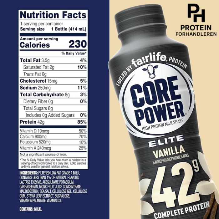 Hver flaske indeholder en kraftfuld mængde på hele 42g protein, hvilket gør det til et ideelt valg for dem, der ønsker at forbedre deres daglige proteinindtag. Dette protein kommer udelukkende fra ultra-filtreret mælk, hvilket sikrer en ren og fyldig smag samt en tilfredsstillende drikkeoplevelse.